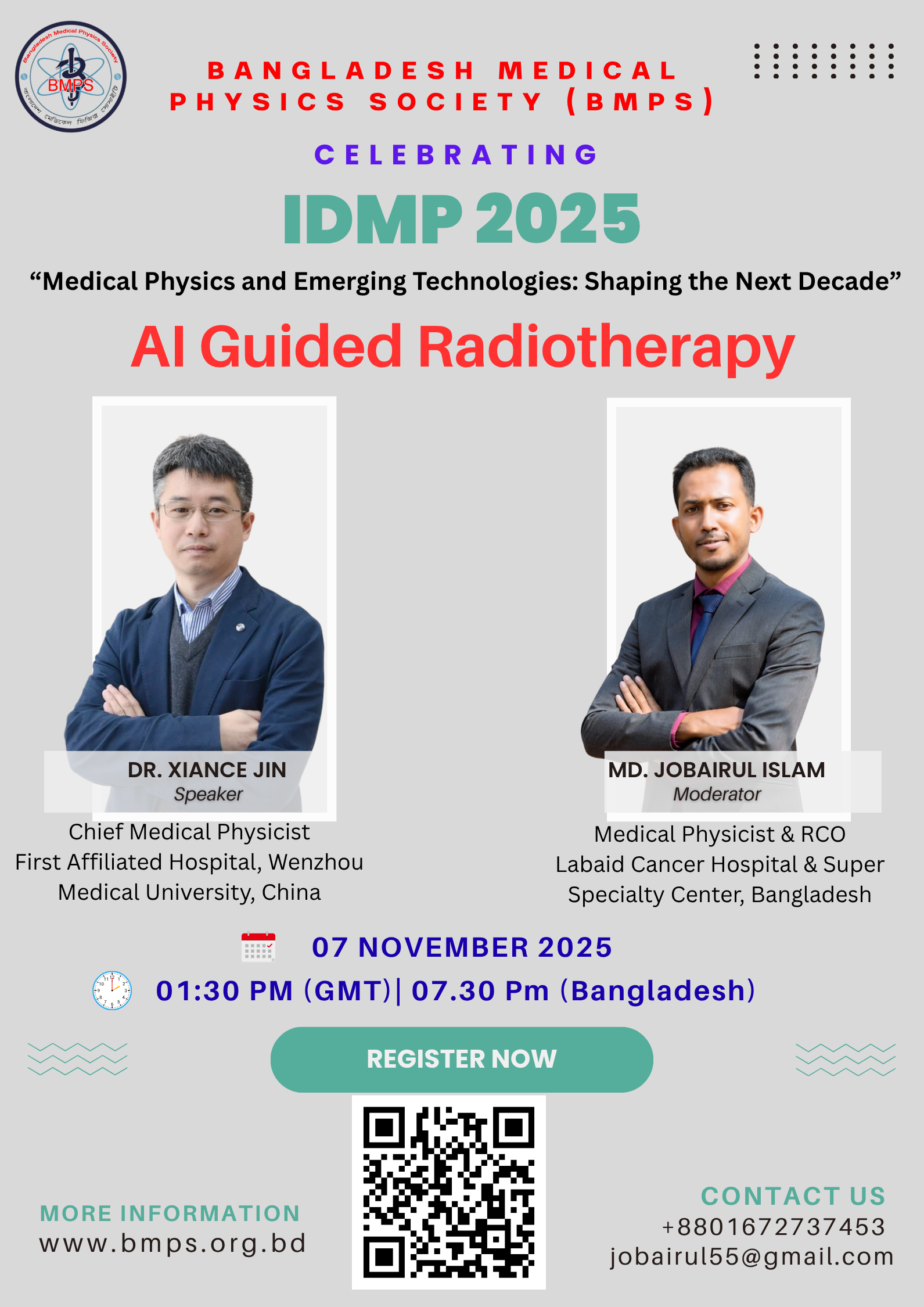 The Bangladesh Medical Physics Society (BMPS) is pleased to announce a special webinar in celebration of the International Day of Medical Physics (IDMP) 2025. This year’s event will feature an expert talk on “AI-Guided Radiotherapy”, highlighting the transformative role of artificial intelligence in modern cancer treatment.